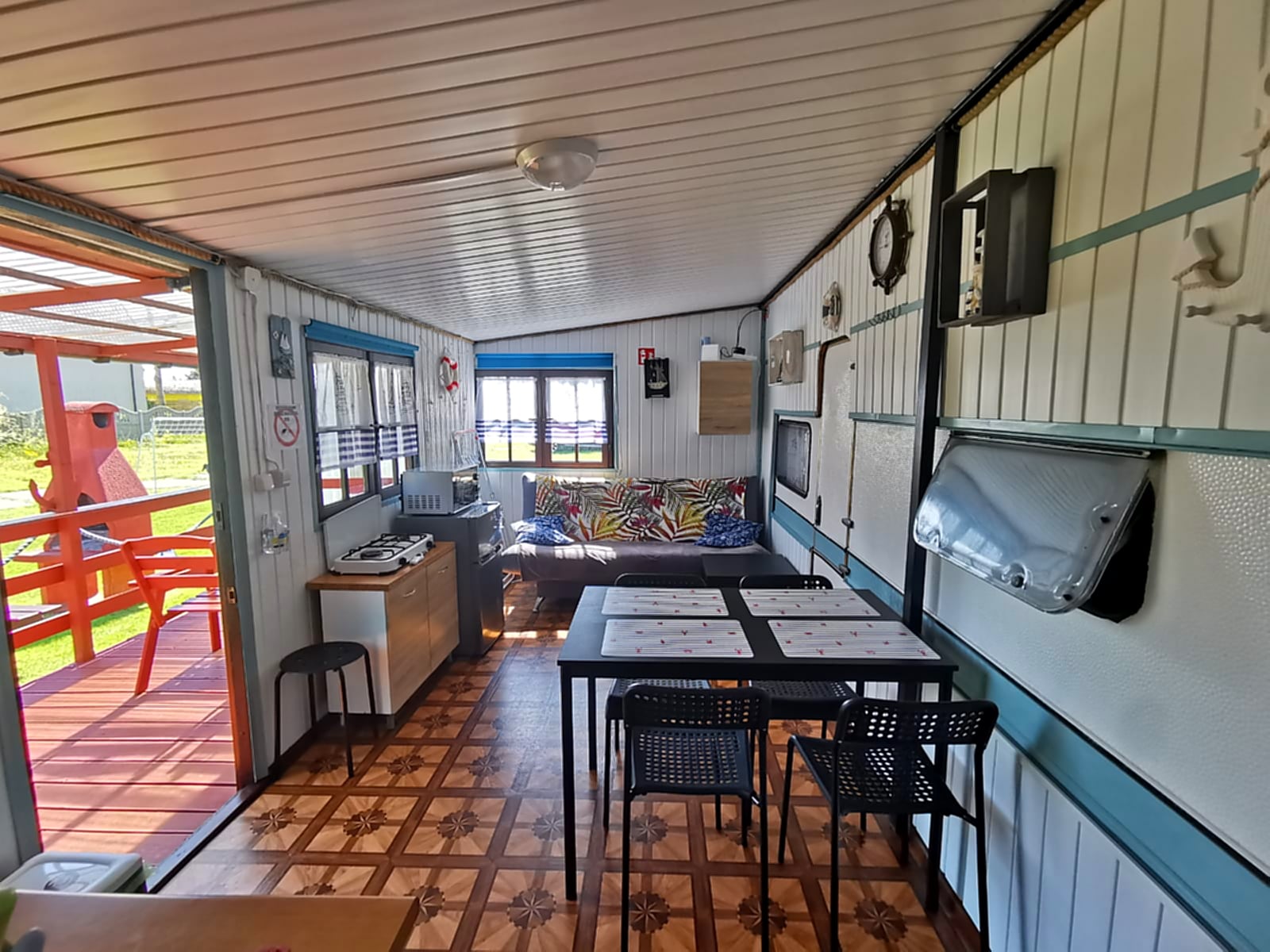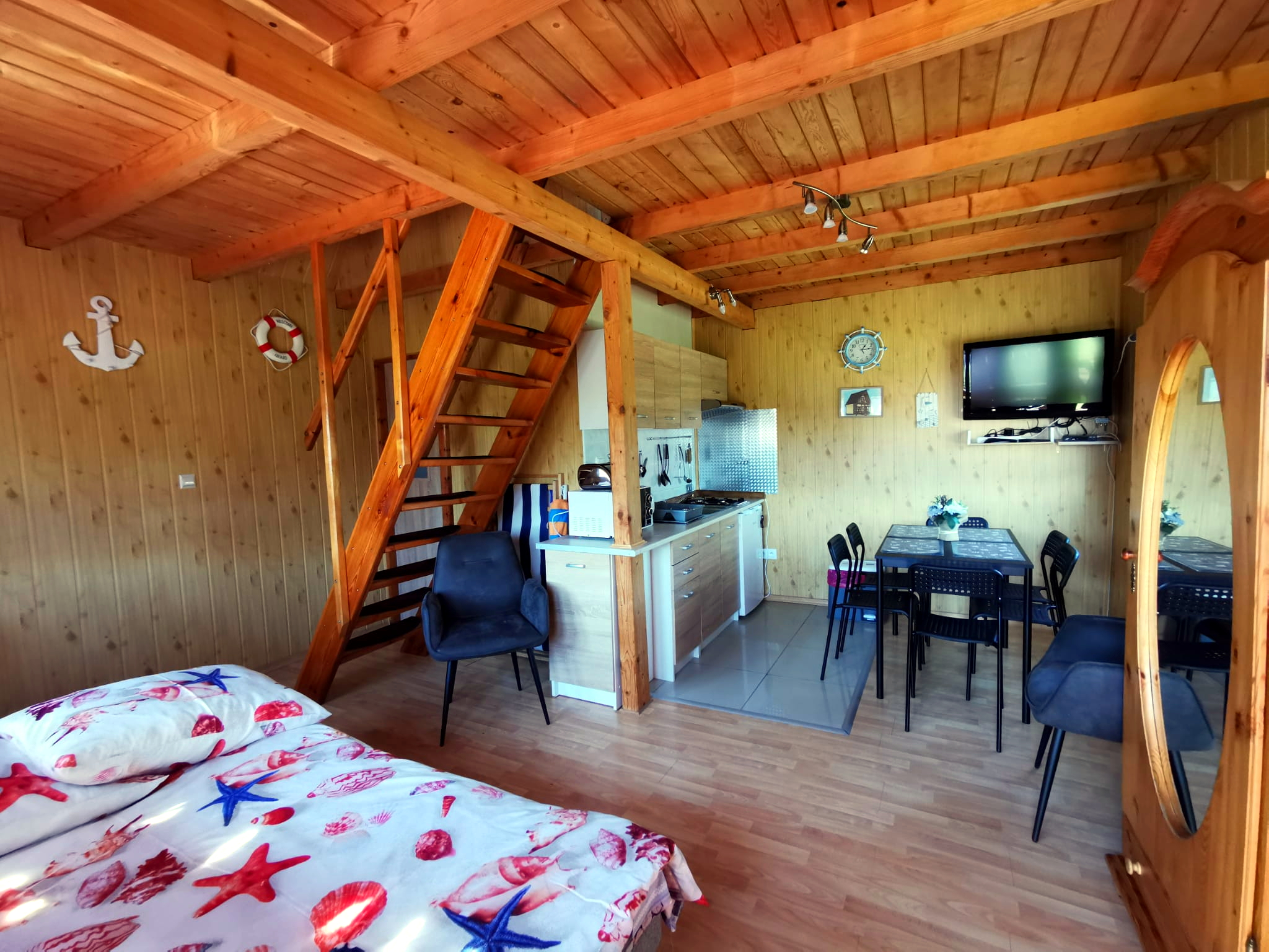 Domek kempingowy 5, 6 osobowy w pełni wyposażony z łazienką, aneksem kuchennym, tarasem oraz grillem.