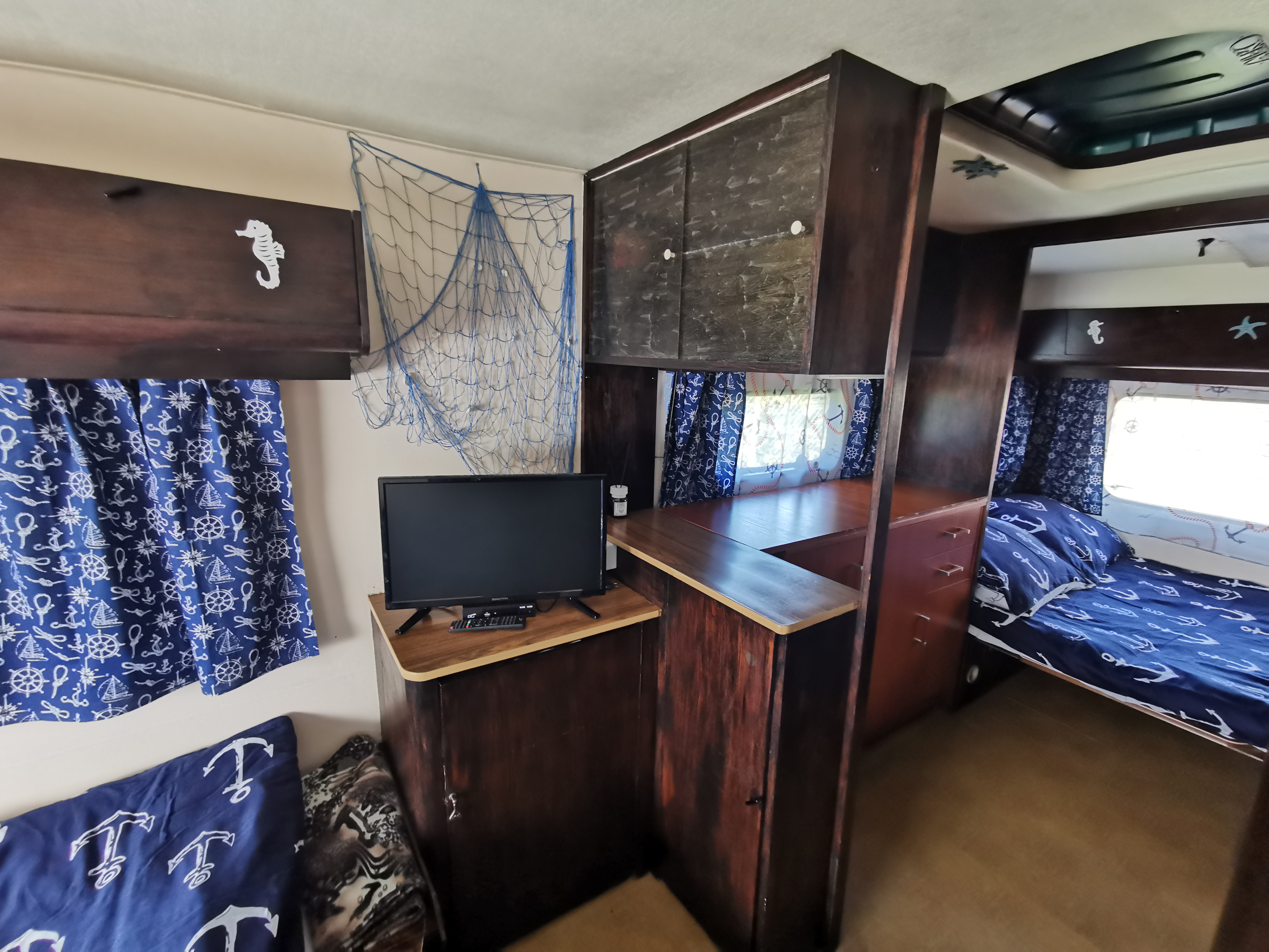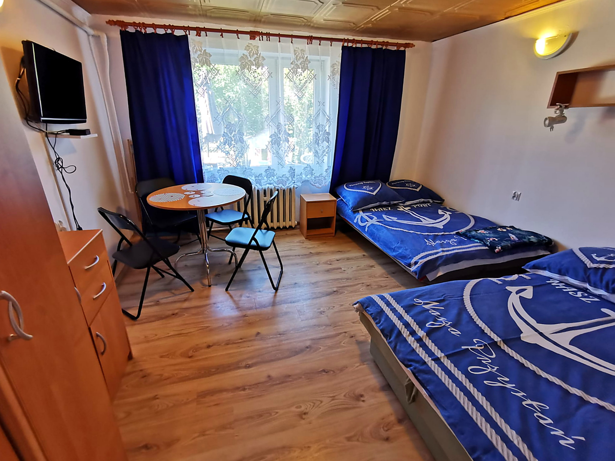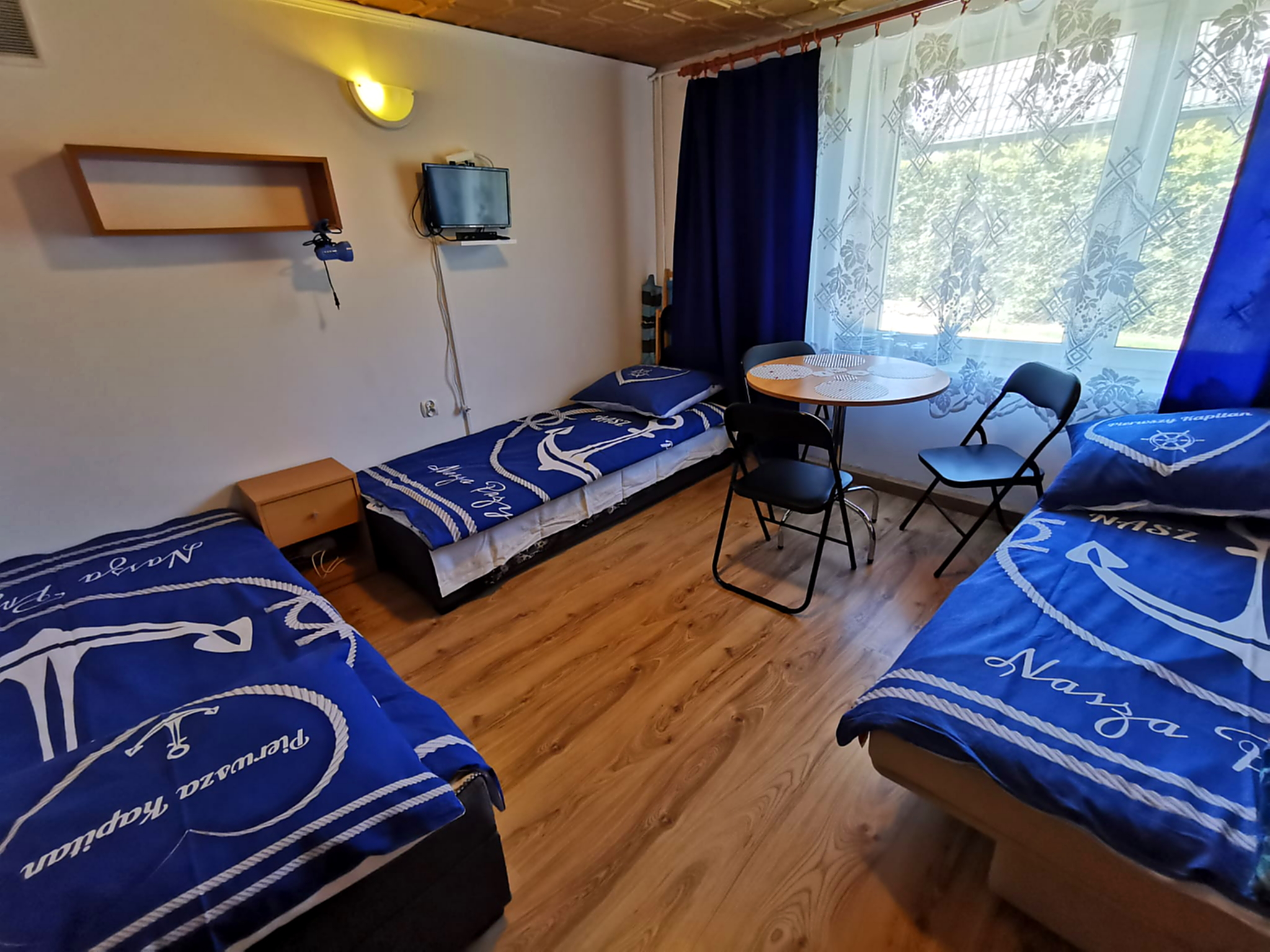Każdy pokój wyposażony jest w: tv z dekoderem, talerze, kubki, sztućce, czajnik elektryczny, leżak, parawan i koc plażowy.