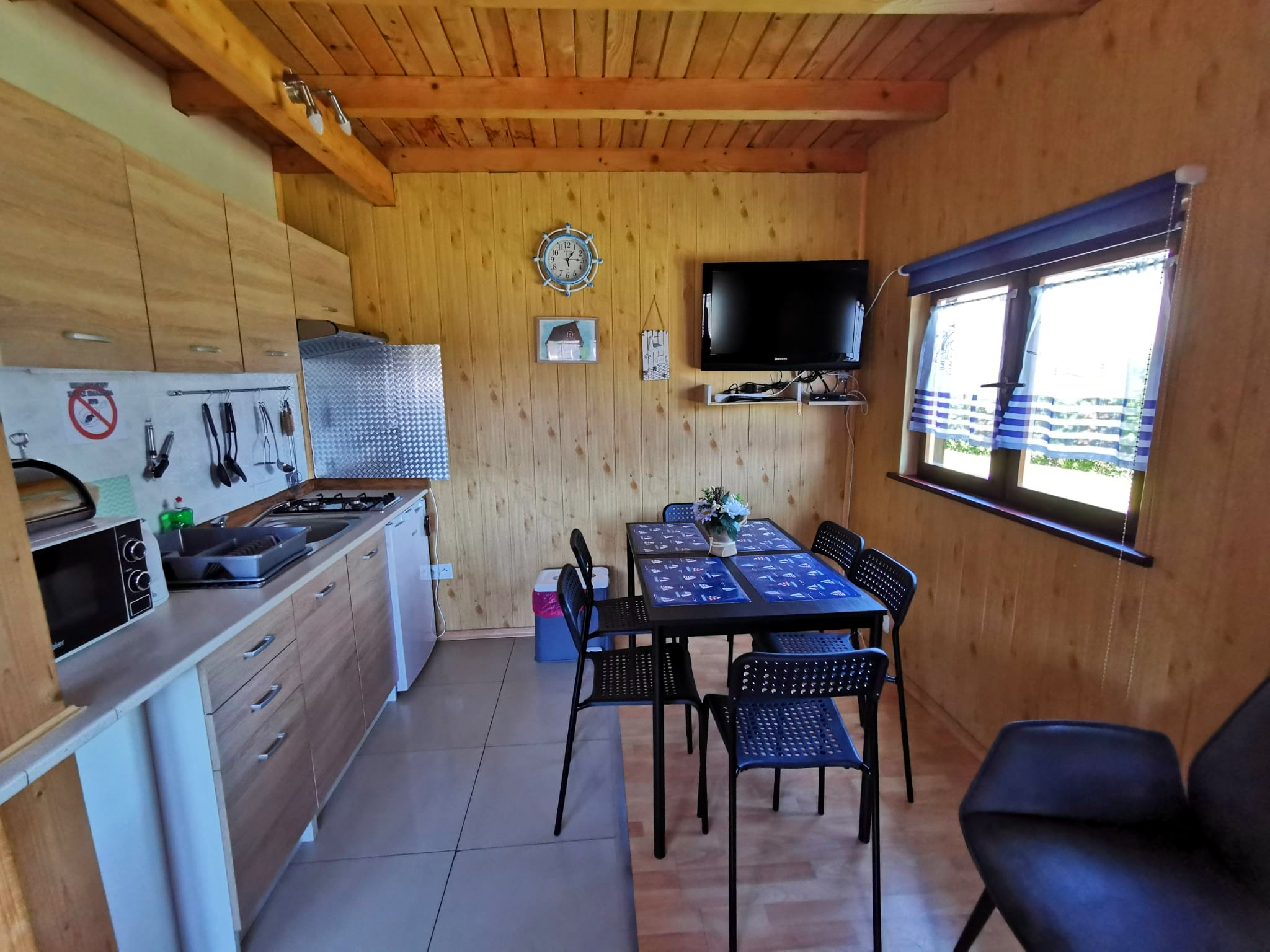 Domek wyposażony jest w: dwa tv z dekoderami, talerze, kubki, sztućce, garnki, czajnik elektryczny, lodówkę, kuchenkę gazową, mikrofalówkę, leżaki, parawan, suszarkę na pranie.