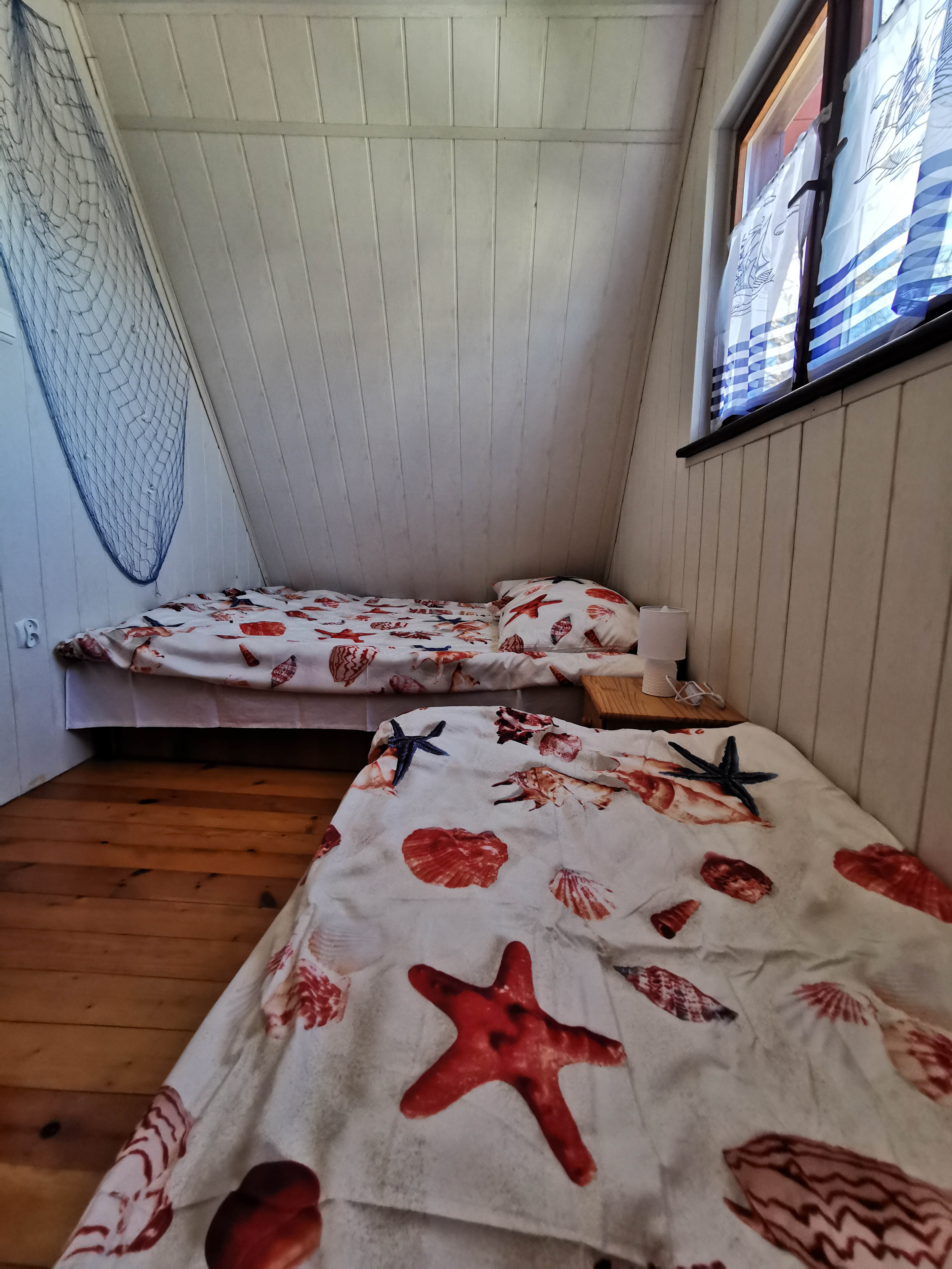 W domku znajduje się sypialnia z dwiema wersalkami oraz jedna wersalka w salonie.