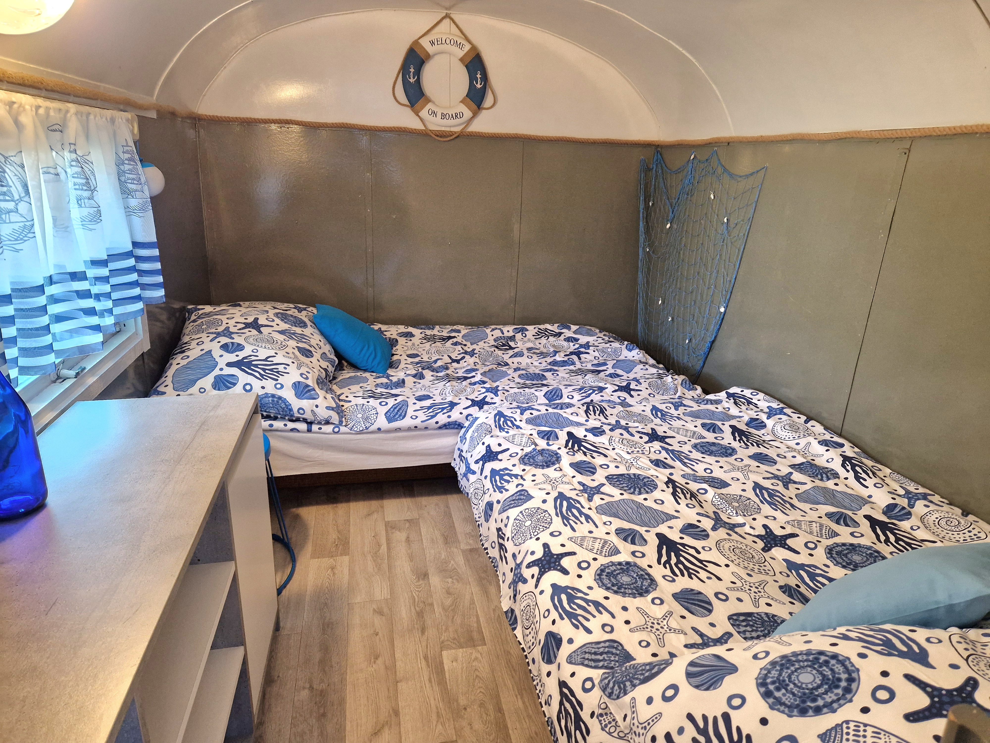 W domku znajdują się dwie sypialnie (jedna zasuwana drzwiami przesuwanymi), jak również jest kanapa w salonie.